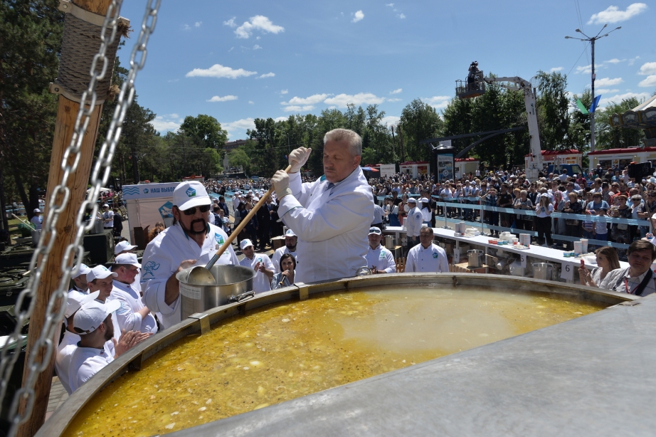 После официальной церемонии Губернатор края принял участие в приготовлении амурской ухи. Как и в прошлом году организаторы планируют раздать не менее 15 тысяч порций для участников и гостей выставки-ярмарки.