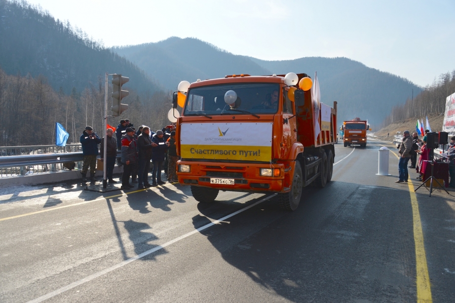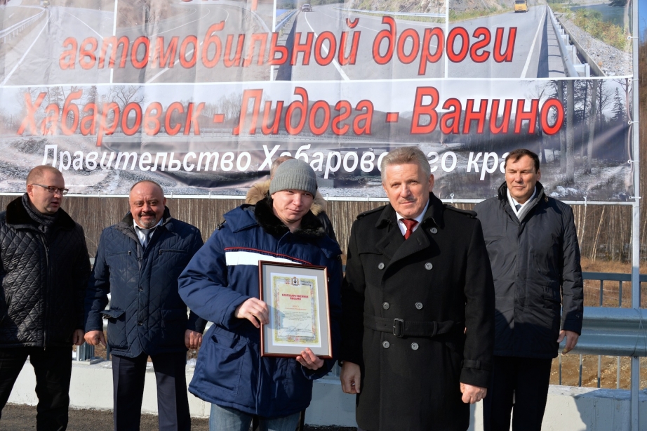 Церемония ввода трассы прошла в субботу на 149 км автомобильной дороги Лидога - Ванино. Губернатор Вячеслав Шпорт, главы Нанайского района Виктор Саватеев и генеральный директор ОАО «Дальстроймеханизация» Федор Глушков зажгли зеленый свет на "пусковом светофоре", дав старт движению тяжелой техники.