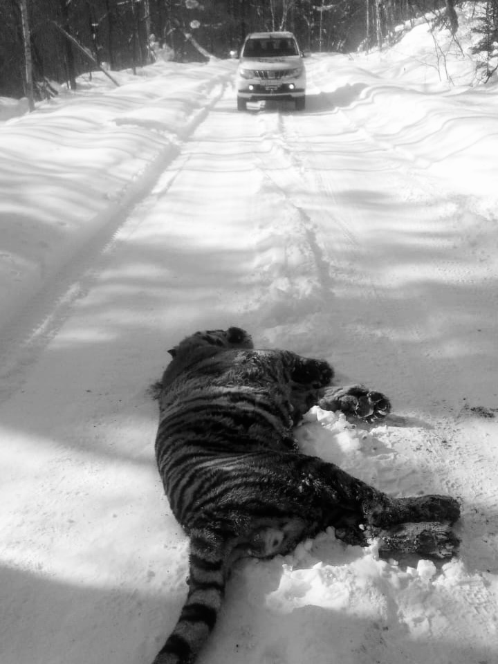 Молодой тигр вступил в поединок с более крупным самцом, размер отпечатка его лапы составляет 12.5 см. Силы оказались не равны, и победитель ушел, а проигравший, получив многочисленные раны, остался на поле брани. Спустя несколько дней он вышел на дорогу, где и умер.
