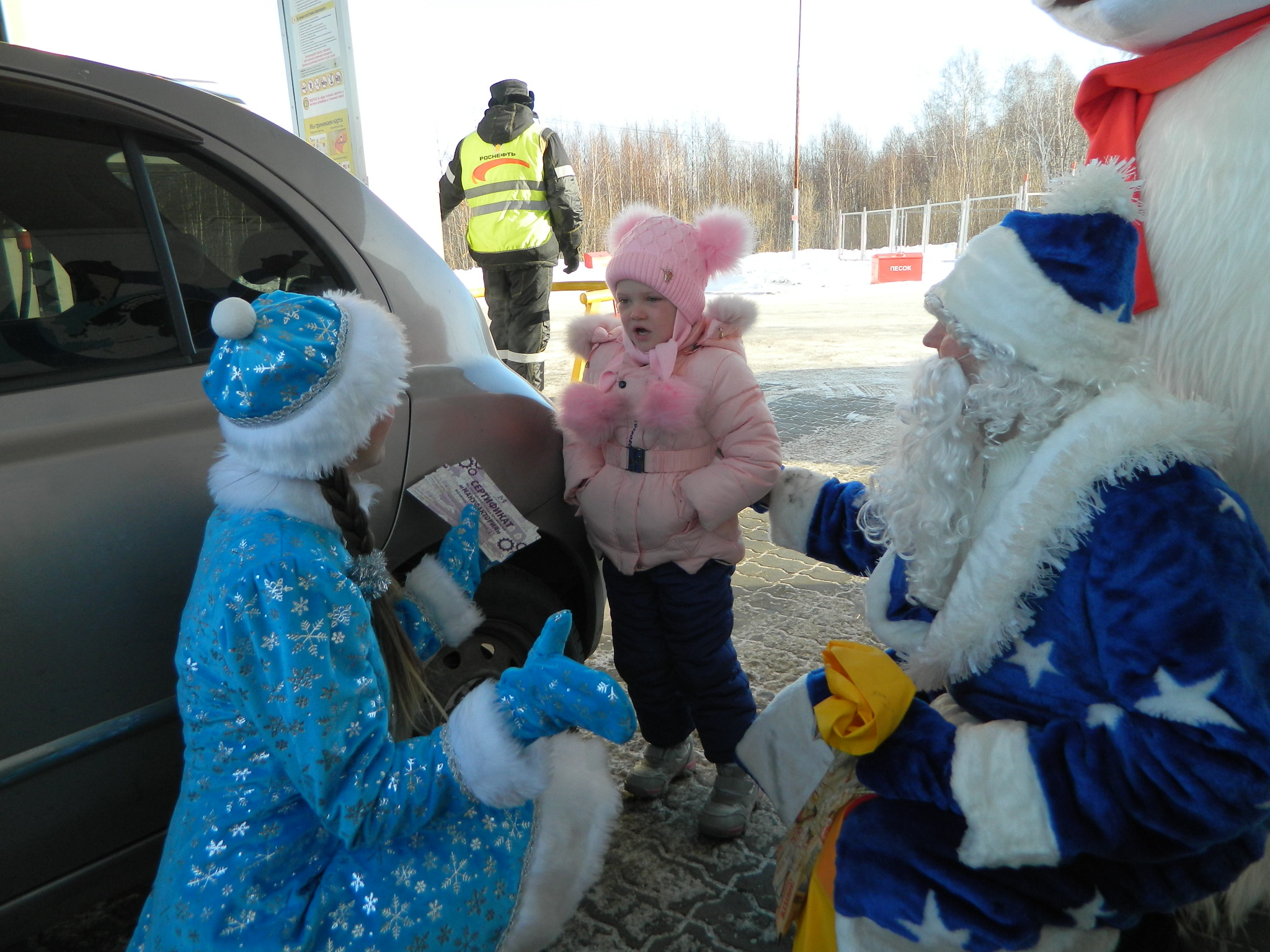 В канун Нового Года сотрудники крупнейшей российской нефтяной компании переоделись в Деда Мороза, Снегурочку и их помощника – Белого Медвежонка и устроили для клиентов нескольких автозаправочных комплексов дальневосточной столицы настоящий праздник. Водителей встречали у топливораздаточных колонок, предлагали поучаствовать в викторине и дарили подарки.