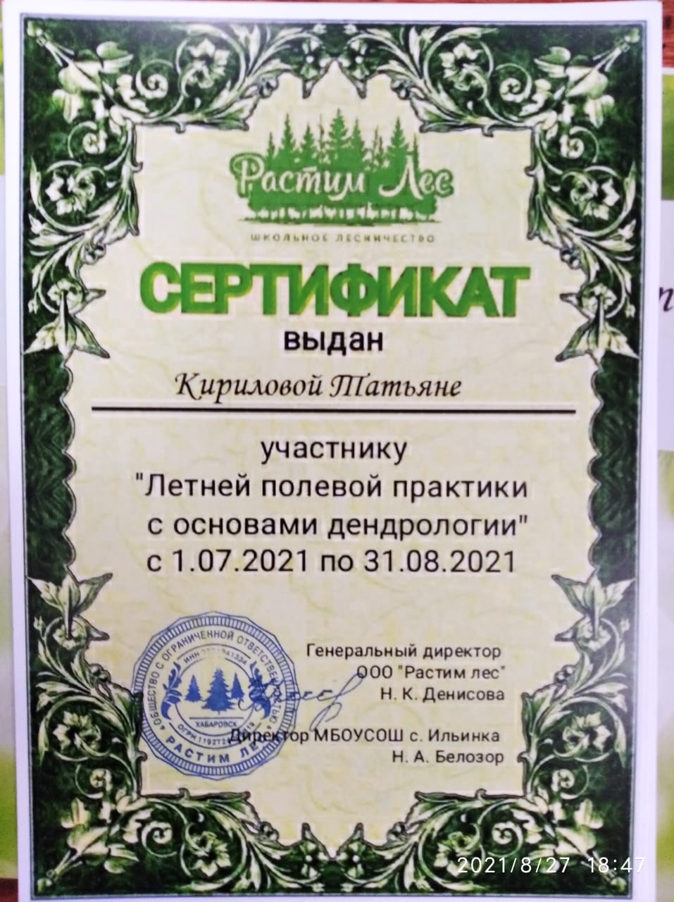 23 школьникам из села Ильинка под Хабаровском вручили сертификаты об окончании летней полевой практики с основами дендрологии. С теплыми словами напутствия к ребятам обратился организатор школьного лесничества, основатель компании «Растим Лес» Иван Денисов, которые пожелал им понимать душу леса и защищать деревья как живых существ.