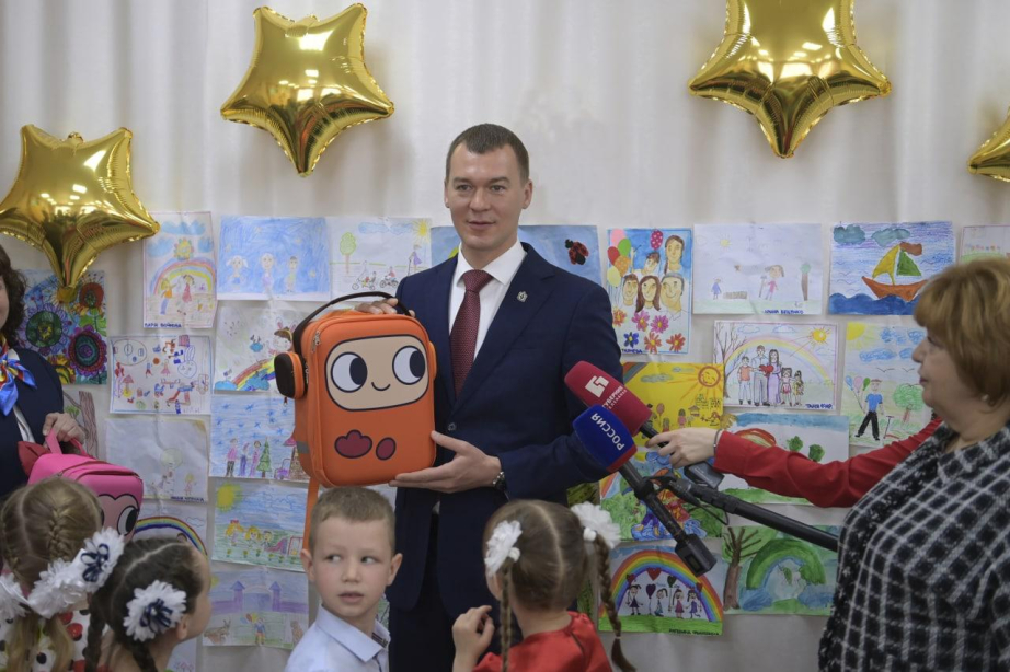 Губернатор побывал в детском саду №78 в Хабаровске и вручил презенты маленьким выпускникам. До начала учебного года 2022/2023 такие же подарочные наборы получат все юные жители края, которые в этом году впервые сядут за парты.