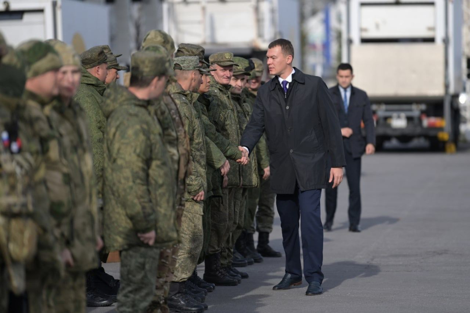 Сегодня губернатор края и врио заместителя командующего войсками Восточного военного округа по военно-политической работе Юрий Вакуленко встретились с военнослужащими-дальневосточниками, призванными по частичной мобилизации для выполнения служебно-боевых задач на территории Донбасса, Запорожской и Херсонской областей, перед их отправкой в зону проведения специальной военной операции.