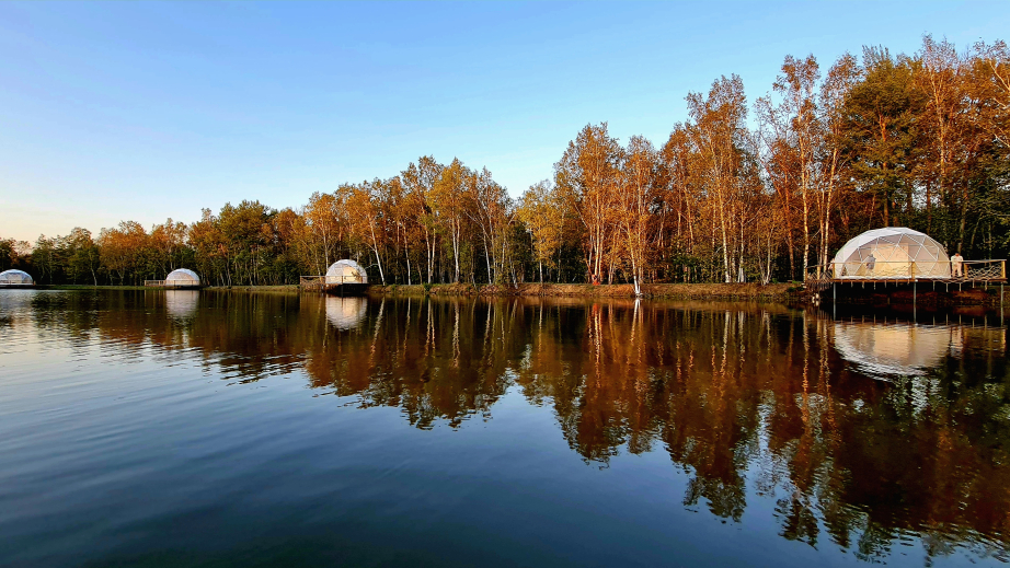 «У нас установлено четыре геокупола – шатра-глэмпинга. Это первая наша очередь, мы планируем вторую очередь на следующем озере сделать. [Собираемся] около десяти шатров поставить в ближайшее время – потом, может, больше. У нас площадь позволяет – есть, куда развиваться», – сказала генеральный директор, управляющая экопарком «Шале на воде» Лариса Третьяк.